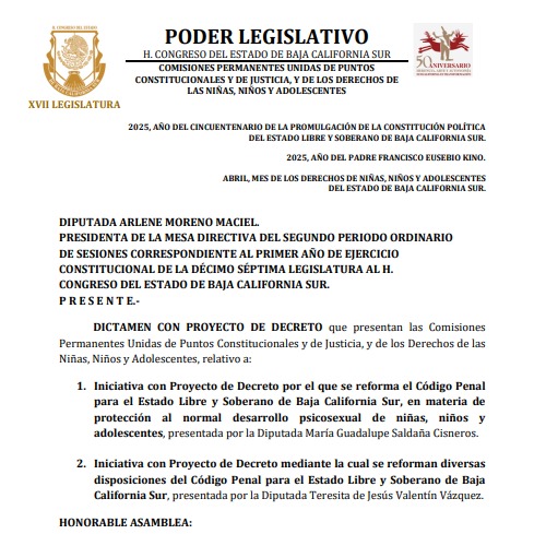 Afortunadamente desde el Congreso del Estado desde la legislatura pasada se han comenzado a dar pasos en firme para la protección de los menores de edad, de las niñas y niños sudcalifornianos contra depredadores sexuales.