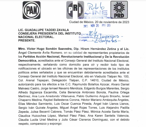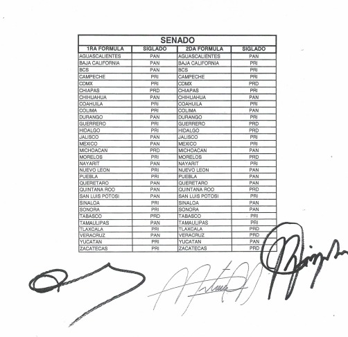 El pasado lunes 20 de noviembre, el PAN, el PRI y el PRD al registrar su coalición electoral ante el Instituto Nacional Electoral denominada “FUERZA Y CORAZÓN X MÉXICO” también registraron sus acuerdos en cuanto a la repartición de espacios en candidaturas federales para el Senado de la República y las Diputaciones Federales.