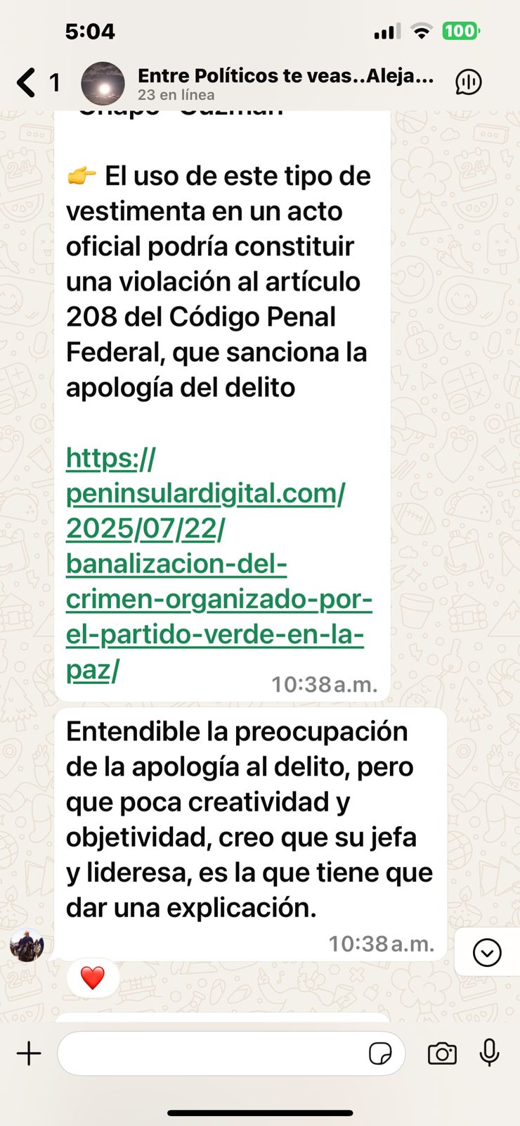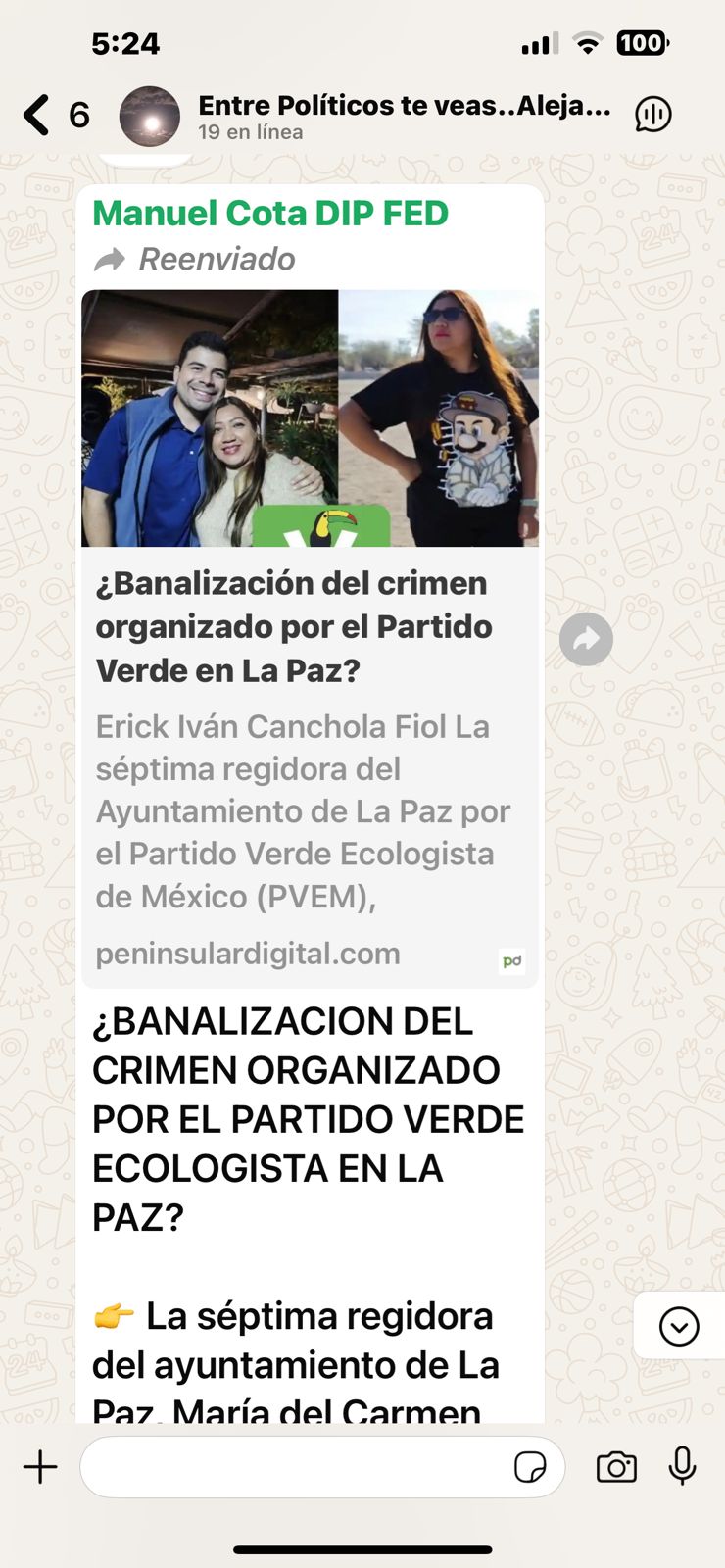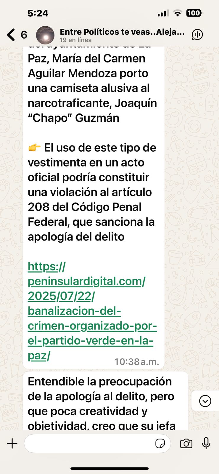 Todo empezó cuando en el grupo se comenzó a comentar sobre el desatino de la regidora de La Paz verde ecologista, María del Carmen Aguilar quien usó una playera de un personaje que parodia al jefe del cartel de Sinaloa, Joaquín El Chapo Guzmán.