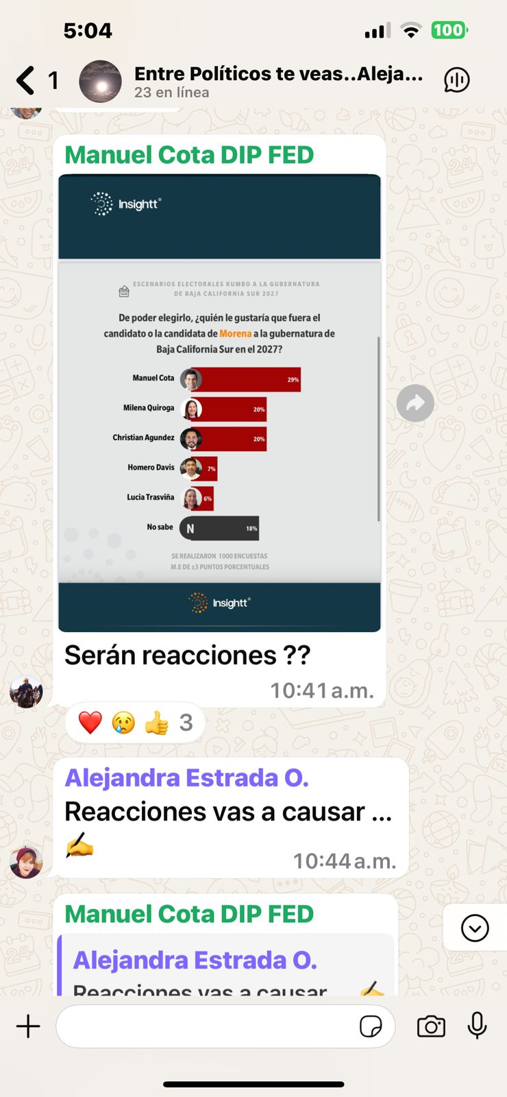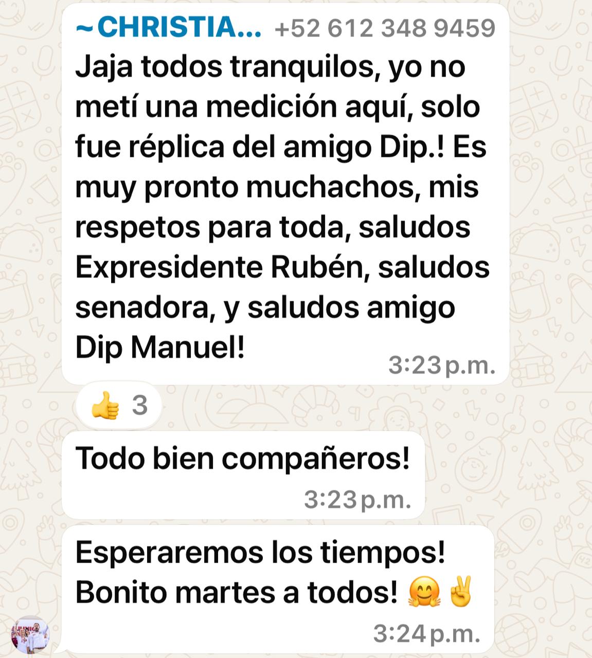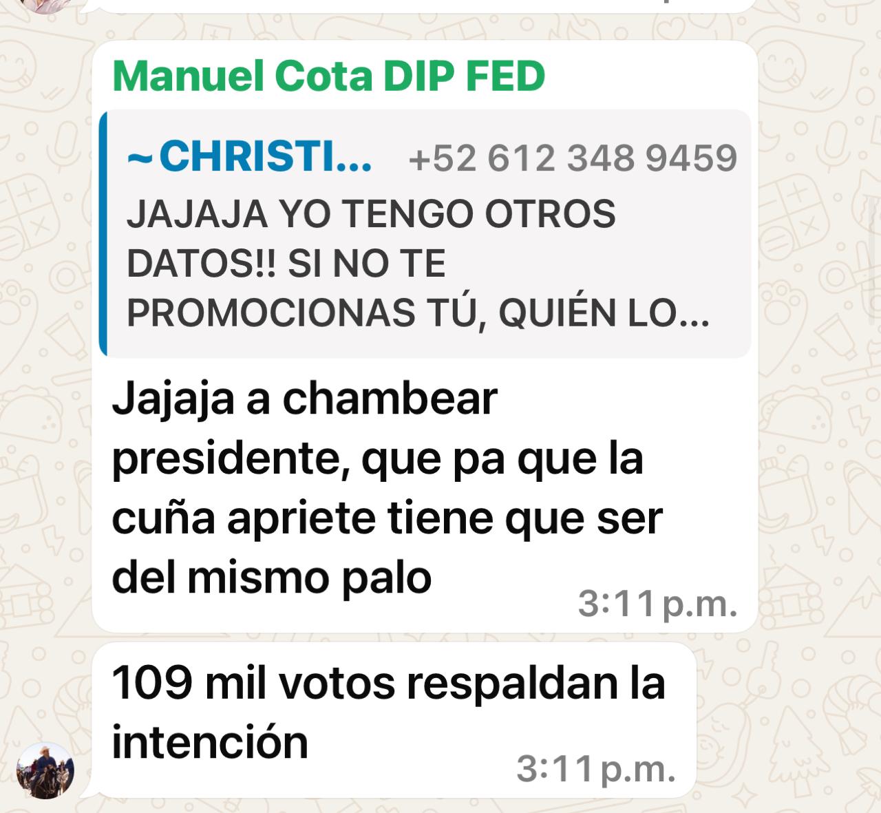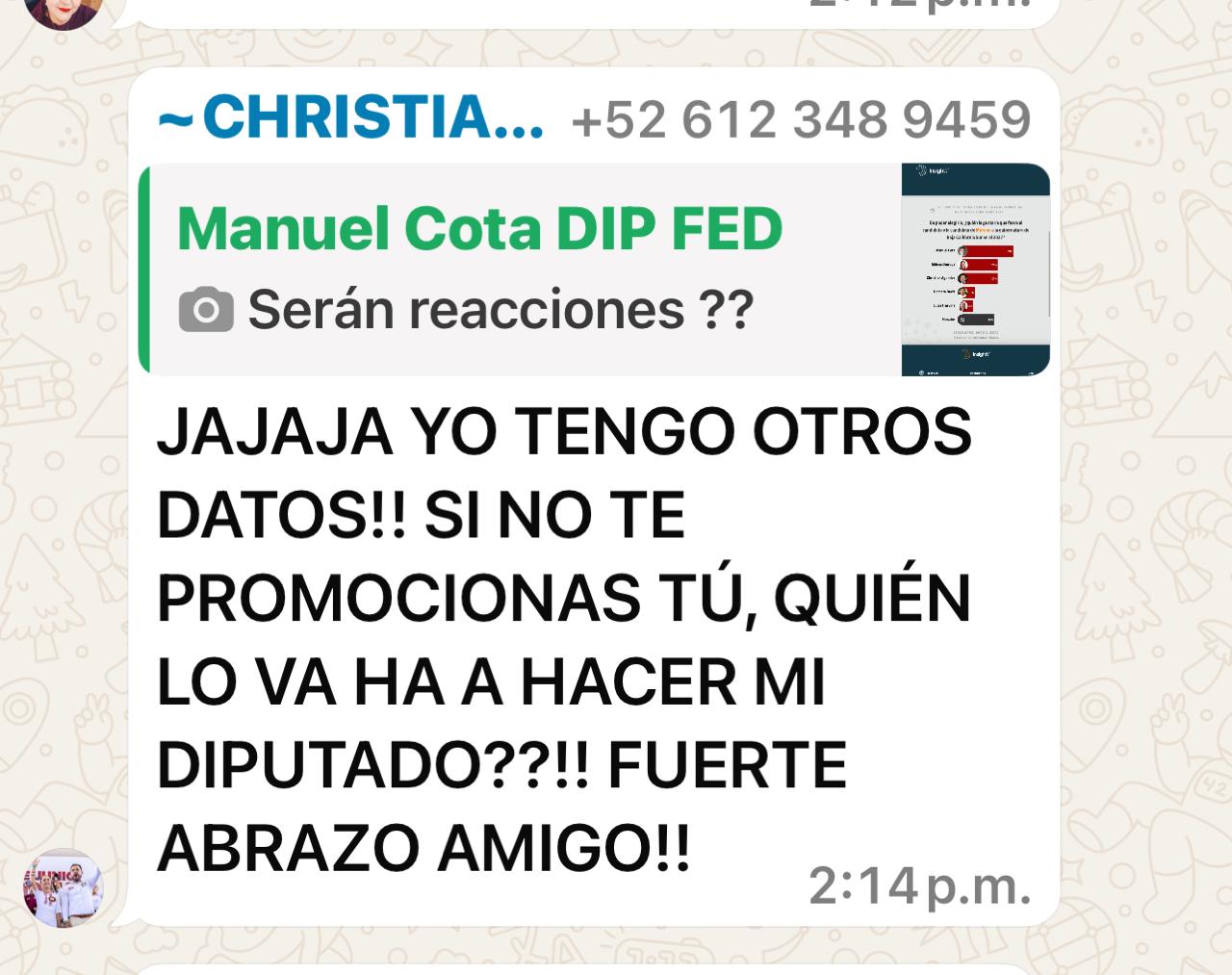 La Paz.-Esta tarde en un grupo de WhatsApp que administra la ex directora de Comunicación Social de Los Cabos, Alejandra Estrada donde convergen políticos y periodistas locales se dio un “agarrón” entre el diputado federal Manuel Cota y el presidente municipal de Los Cabos, Christian Agúndez por encuestas tempraneras a la sucesión en la gubernatura.