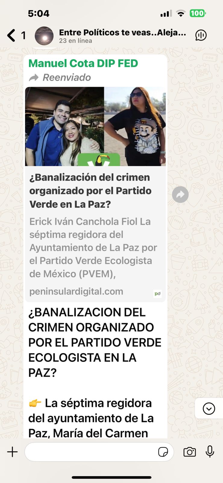 Dentro del debate, el diputado Manuel Cota compartió una nota donde mediante fotografías se le relaciona con la regidora, con el título “Banalización del crimen organizado por el Partido Verde en La Paz”.
