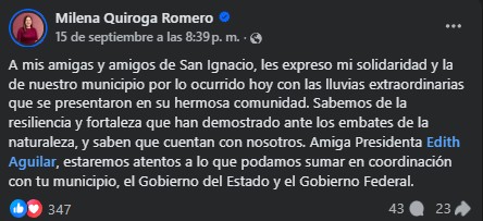 Por su parte, la alcaldesa de La Paz, Milena Quiroga, envió un mensaje de ánimo a las familias de San Ignacio, reconociendo su fortaleza y resiliencia ante los embates de la naturaleza. Subrayó que el municipio paceño estará atento para sumar esfuerzos en coordinación con Mulegé, el Gobierno del Estado y la Federación.