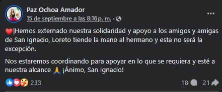 En el mismo sentido, la presidenta municipal de Loreto, Paz Ochoa Amador, reiteró que el pueblo loretano no será indiferente en estos momentos difíciles y que se coordinará para apoyar en lo que esté a su alcance. “¡Ánimo, San Ignacio!”, expresó.