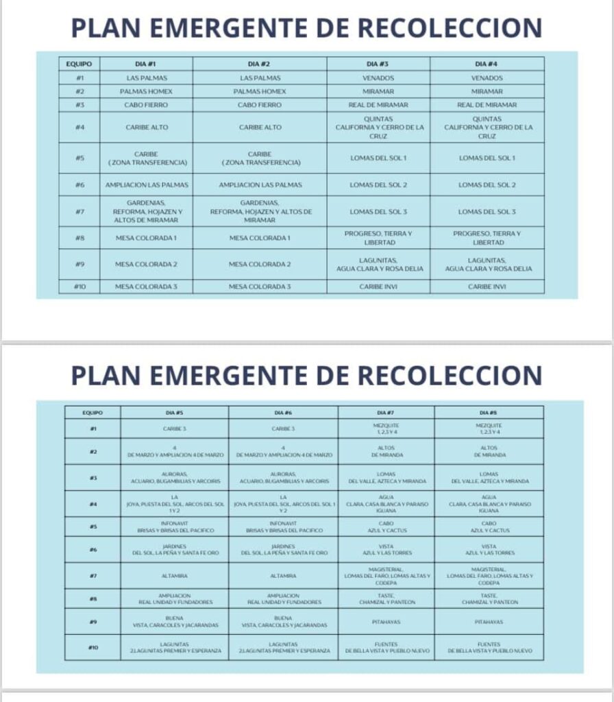 Este plan permanecerá durante 10 días, en cada uno de estos se atenderán 9 colonias distintas. Este es el calendarios de recolección de basura: