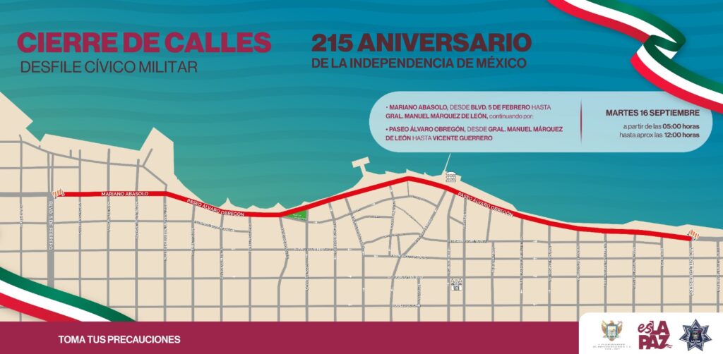 La Paz, BCS.—Con motivo del 215 Aniversario del Inicio de la Independencia de México, las autoridades municipales hicieron un llamado a la ciudadanía para tomar precauciones ante los cierres viales y sumarse con responsabilidad a los festejos patrios. La Dirección General de Seguridad Pública, Policía Preventiva y Tránsito Municipal implementará un operativo especial en coordinación con fuerzas federales, estatales y cuerpos de auxilio, con el fin de garantizar la seguridad de todas las familias.