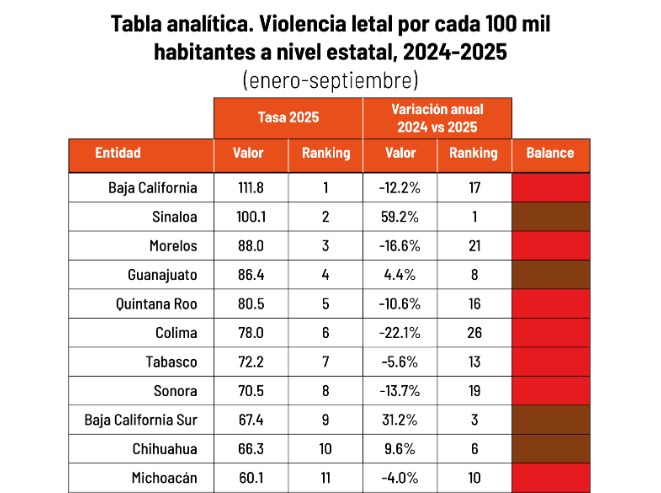 El análisis —que combina los indicadores de homicidios dolosos, feminicidios, homicidios culposos y personas desaparecidas— ubica a Baja California Sur en el grupo de las 10 entidades con “balance muy negativo”, junto con Guanajuato, Chihuahua, Sinaloa, Zacatecas y Morelos.