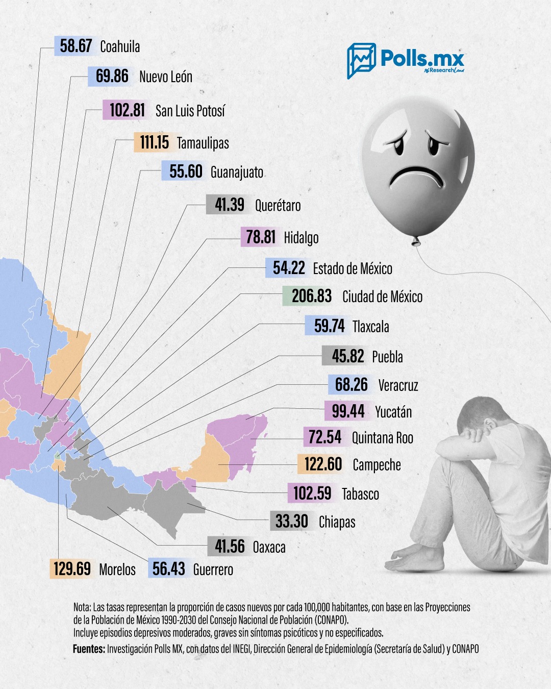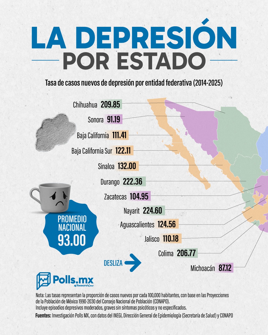 La Paz.-Baja California Sur se encuentra por arriba del promedio nacional en la tasa de nuevos casos de depresión, de acuerdo con un análisis basado en datos estadísticos difundidos por Polls MX, con información del INEGI, la Dirección General de Epidemiología y el Consejo Nacional de Población (CONAPO).