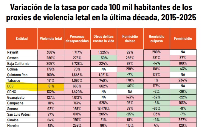 En el caso de Baja California Sur, la combinación de una alta tasa de desapariciones y una incidencia elevada de homicidio doloso configura un panorama que, según la ONG, debe analizarse con enfoque estructural y no sólo coyuntural.