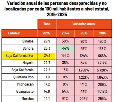 Según el documento, Baja California Sur registra una tasa de 24.1 personas desaparecidas por cada 100 mil habitantes en 2025, lo que la coloca en el tercer lugar nacional, sólo por debajo de Sinaloa y Sonora.