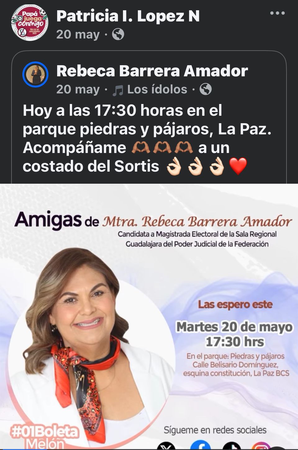 Así, en la campaña de la elección judicial, recibió público apoyo de la propia Patricia López, quien en sus redes sociales la promovía como su candidata de la “Boleta Melón”.