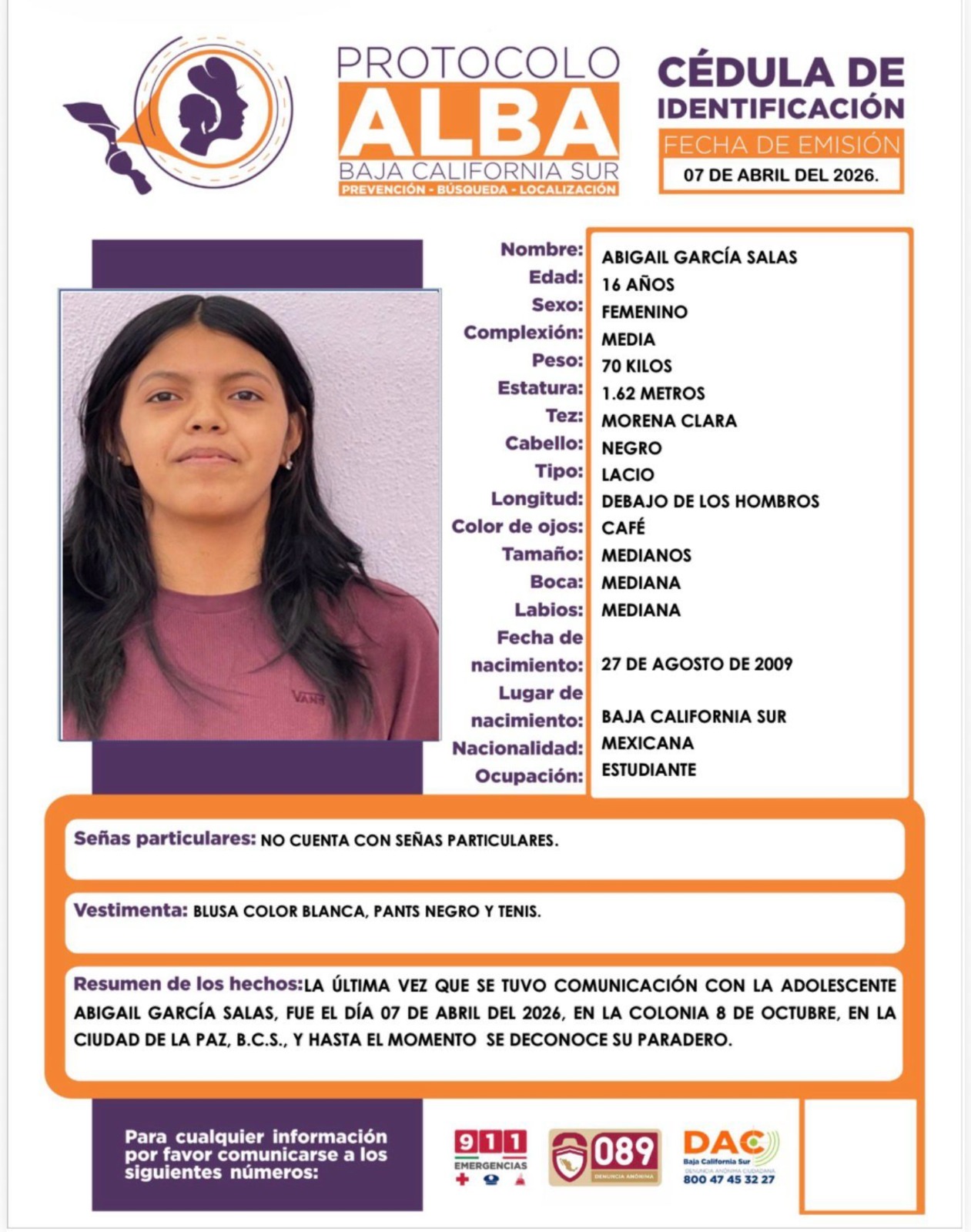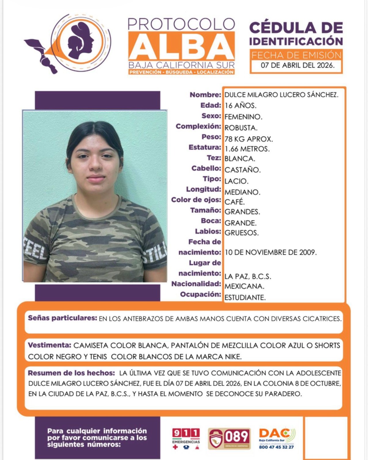 Las fichas del Protocolo Alba señalan que Dulce Milagro Lucero Sánchez, de 16 años, fue vista por última vez el 7 de abril de 2026 en la colonia 8 de Octubre, en La Paz. Como señas particulares, presenta cicatrices en ambos antebrazos.