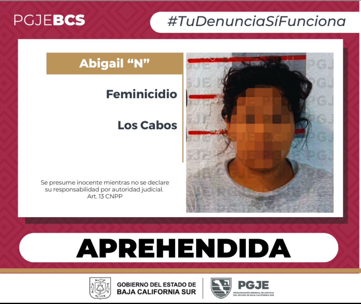 Las investigaciones avanzaron y, con los datos de prueba obtenidos, el agente del Ministerio Público solicitó al Juez de Control una orden de aprehensión. La tarde del 15 de agosto, agentes de la Subprocuraduría de Atención a Delitos de Alto Impacto (SADAI) localizaron a la presunta responsable en calles de la colonia Vista Hermosa.