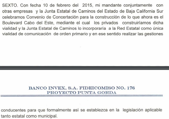 “Sexto. Con fecha de 10 de febrero de 2015, mi mandante conjuntamente con otras empresas y la Junta Estatal de Caminos del Estado de Baja California Sur CELEBRAMOS EL CONVENIO DE CONCERTACIÓN PARA LA CONSTRUCCIÓN DE LO QUE AHORA ES SEL BOULEVARD CABO DEL ESTE, mediante el cual los privados construiríamos dicha vialidad y la Junta Estatal de Caminos lo incorporaría a la red estatal como única vialidad de comunicación de orden primario y en ese sentido realizar las gestiones conducentes para que formalmente así se establezca en la legislación aplicable tanto estata como municipal”.