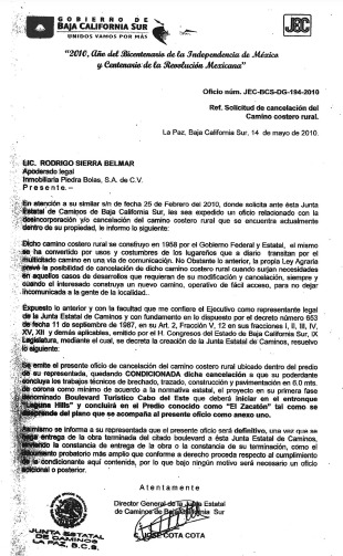 En el oficio JEC-BCS-DG titulado “Solicitud de Cancelación del Camino Costero Rural”, del 14 de mayo del 2010 el entonces director de la Junta Estatal de Caminos, José Cota Cota, emitió un “OFICIO DE CANCELACIÓN DEL CAMINO COSTERO” en favor del solicitante, la empresa Inmobiliaria Piedra Bola, S.A. de C.V., representada por Rodrigo Sierra Belmar.