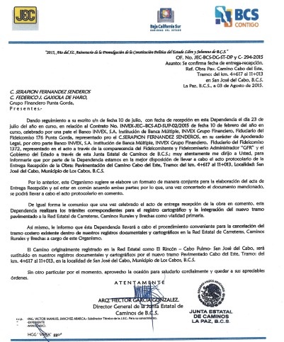 Lo cual se confirma en el oficio de la Junta Estatal de Caminos, JEC-BCS-DGST-DP, del 3 de agosto del 2015 firmado por el director de la JEC, Héctor García González dirigido al Grupo Financiero Punta Gorda, el Gobierno del Estado confirmaba la fecha para la entrega-recepción de la obra de pavimentación del camino Cabo del Este.