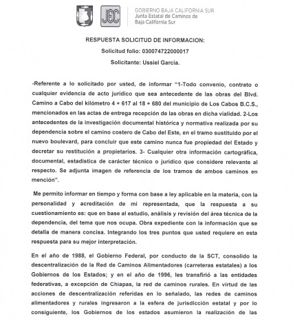 … “Es importante señalar que únicamente una parte del tramo en fechas recientes tuvo una modificación, misma que fue informada al H. Ayuntamiento de Los Cabos, siendo nuestra intervención como ente descentralizado y facultado del Gobierno del Estado de Baja California Sur, el quitar de nuestra Red Estatal el camino anterior para sustituirlo por el nuevo, jamás autorizando la cancelación, cierre o negar el acceso, ya que no estamos facultados para eso”.