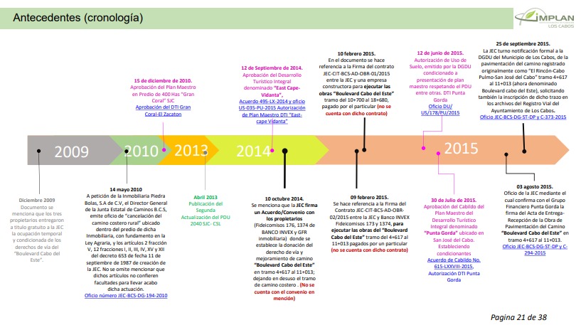 En un documento titulado “Resumen del expediente relativo al Camino Costero a Cabo del Este, SJC; para el seguimiento jurídico por parte del Ayuntamiento de Los Cabos”, en abril de 2023, el Instituto Municipal de Planeación elaboró una línea de tiempo para ilustrar el proceso del pretendido desuso y sustitución del camino costero de Cabo del Este a favor de tres desarrolladores turísticos.