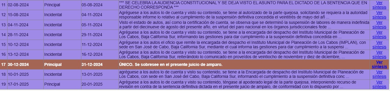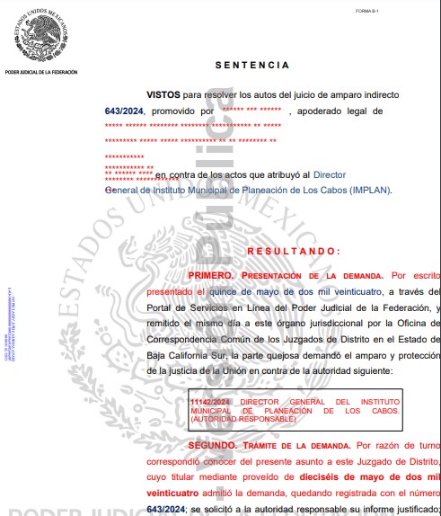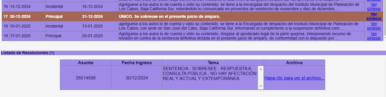 Pero si el amparo al que se refieren es el amparo indirecto 643/2024 promovido ante Juzgado Primero de Distrito en el Estado de Baja California Sur por el desarrollo Playa Gorda, uno de los cuatro desarrollos turísticos involucrados en la controversia del camino costero, dicho juicio SE SENTENCIÓ SOBRESEÍDO POR LA AUTORIDAD JUDICIAL EL 30 DE DICIEMBRE DE 2024, ES DECIR, APROXIMADAMENTE 20 DÍAS ANTES DE LA SESIÓN DE CABILDO DONDE SE VOTÓ LO DEL PDU.