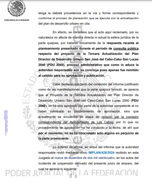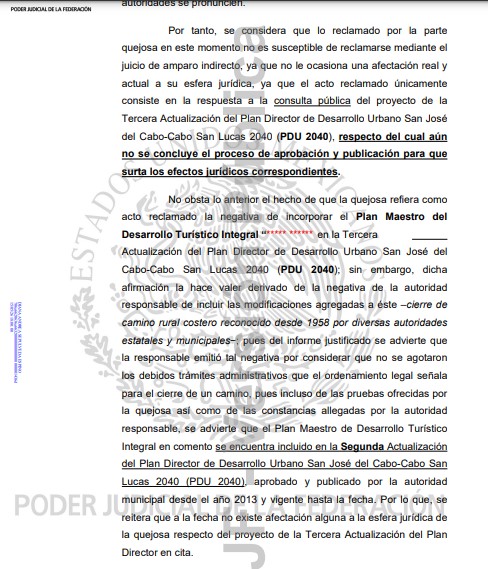 “Pues incluso de las pruebas ofrecidas por la quejosa así como de las constancias allegadas por la autoridad responsable, se advierte que el Plan Maestro de Desarrollo Turístico Integral en comento se encuentra incluido en la Segunda Actualización del Plan Director de Desarrollo Urbano San José del Cabo-Cabo San Lucas 2040 (PDU 2040), aprobado y publicado por la autoridad municipal desde el año 2013 y vigente hasta la fecha. Por lo que, se reitera que a la fecha no existe afectación alguna a la esfera jurídica de la quejosa respecto del proyecto de la Tercera Actualización del Plan Director en cita”.