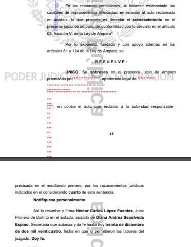 En la sentencia en poder de HOY BCS, se detallan diversas valoraciones del Juzgado para sobreseer el juicio de amparo: