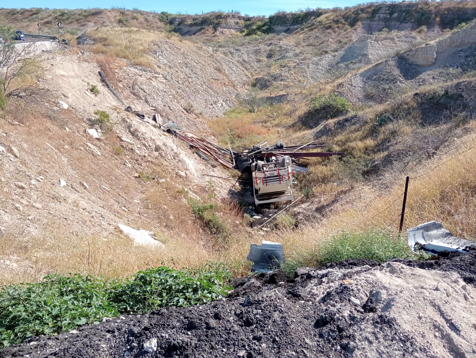 De acuerdo con el reporte oficial, el accidente fue atendido alrededor de las 11:20 horas, luego de que se recibiera el aviso sobre una volcadura en ese tramo carretero. Al arribar al sitio, las autoridades confirmaron que la unidad había terminado fuera de la cinta asfáltica, al fondo de un barranco, con parte de la carga esparcida.