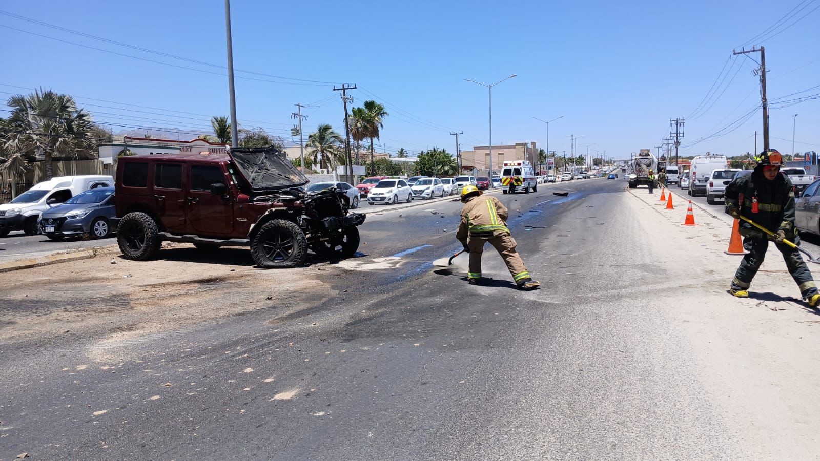 Estuvo involucrado un vehículo particular y una unidad de transporte de concreto, cerca de la zona de Chedraui. Tras el reporte, elementos del Departamento de Bomberos de San José del Cabo, adscritos a la de San José Viejo, acudieron al sitio a bordo de las unidades M-60 y A-615 para atender la emergencia.