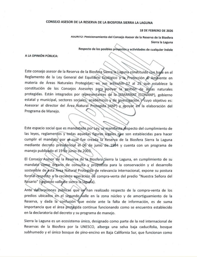 La Paz.-El Consejo Asesor de la Reserva de la Biósfera Sierra La Laguna demandó transparencia total en cualquier proyecto o actividad que se pretenda desarrollar dentro de esta Área Natural Protegida (ANP) y en su zona de influencia, al advertir que la falta de información genera incertidumbre social y riesgos para la conservación del ecosistema.
