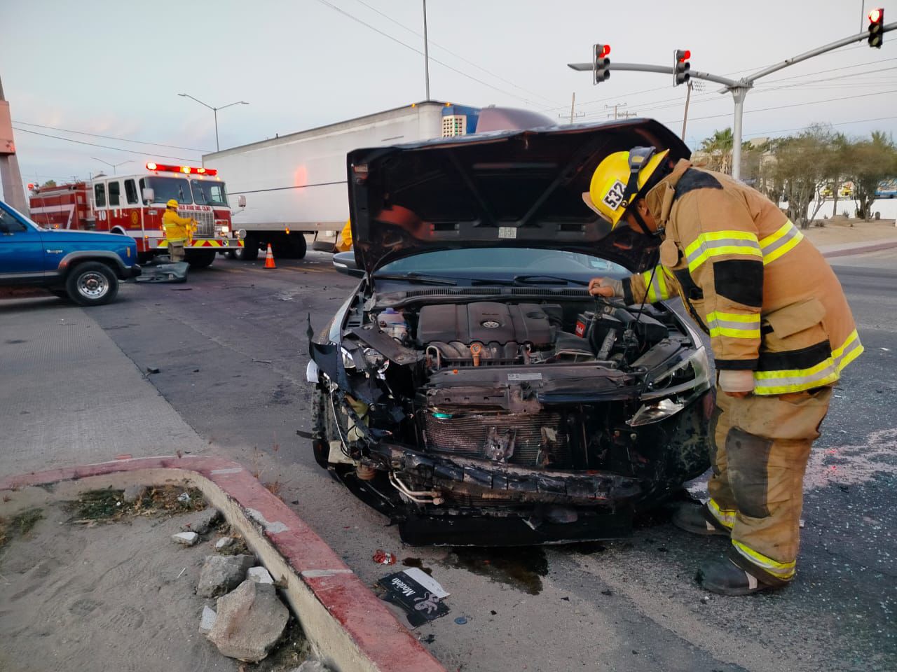 Tras una llamada de emergencia, el Departamento de Bomberos de San José del Cabo, la Cruz Roja Mexicana y la Guardia Nacional llegaron a la carretera transpeninsular a la altura de la calle Manuel Doblado para atender el accidente.