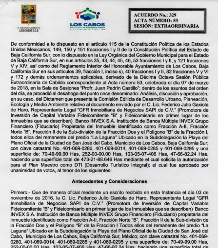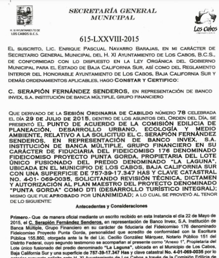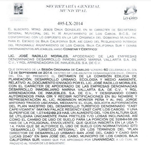 En el dictamen de autorización por cabildo del plan maestro de East Cape Vidanta, el 12 de septiembre del 2014, durante el periodo de gobierno de Antonio Agúndez, se estipula: