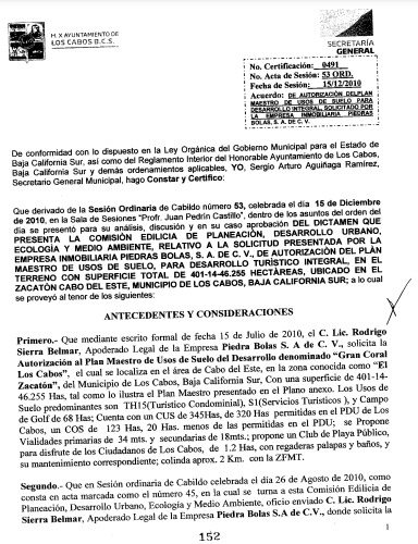 En el dictamen de autorización condicionada por cabildo del plan maestro de Gran Coral y/o El Zacatón, el 15 de diciembre de 2010, durante el periodo de gobierno de Mirna Xibillé, se estipula: