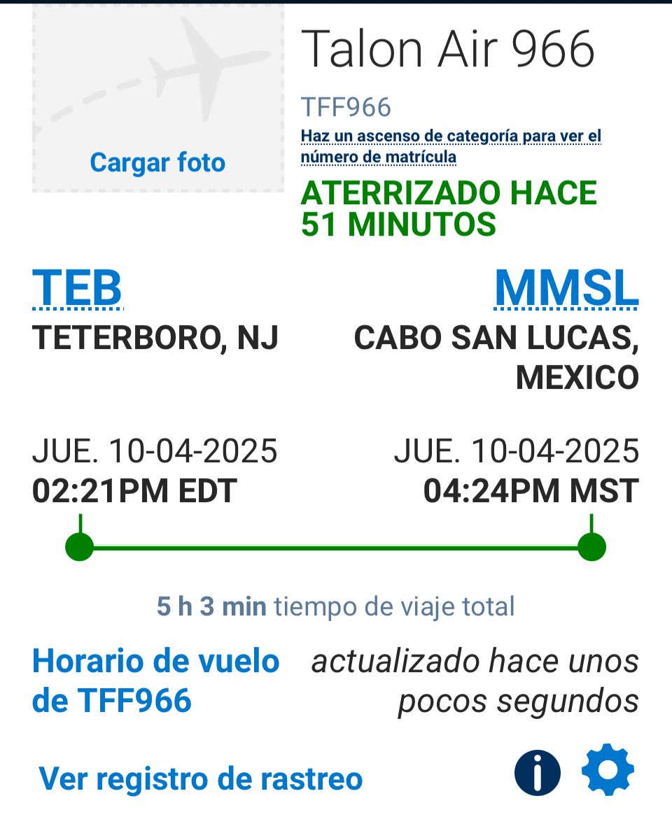 El itinerario público de la aeronave marca que salió del aeropuerto de Terterboro, New Jersey, de Estados Unidos a las 2:21 de la tarde y aterrizó a las 4:24 de la tarde en Cabo San Lucas.