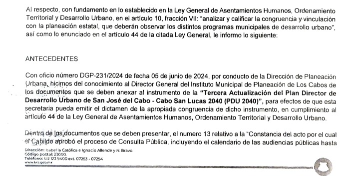 Dicho de manera sencilla, LA SECRETARÍA DE PLANEACIÓN URBANA E INFRAESTRUCTURA RESOLVIÓ QUE EL AYUNTAMIENTO DE LOS CABOS NO PRESENTÓ EL DOCUMENTO QUE ACREDITARA QUE EL CABILDO APROBÓ QUE SE INICIARA LA CONSULTA PÚBLICA DEL PDU Y QUE POR ESO ES NULO EL PROCEDIMIENTO, POR LO QUE LE INSTRUYE VOLVER A HACER LA CONSULTA PÚBLICA.