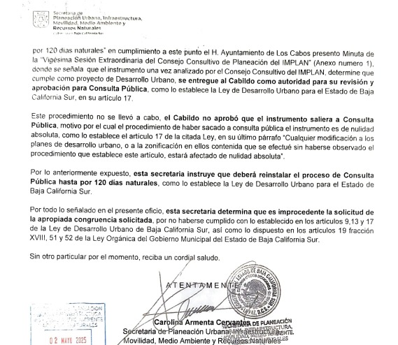 El 29 de abril, el Gobierno del Estado a través de la Secretaría de Planeación Urbana e Infraestructura resolvió declarar improcedente el dictamen de congruencia de la tercera actualización del Plan de Desarrollo Urbano de Los Cabos.