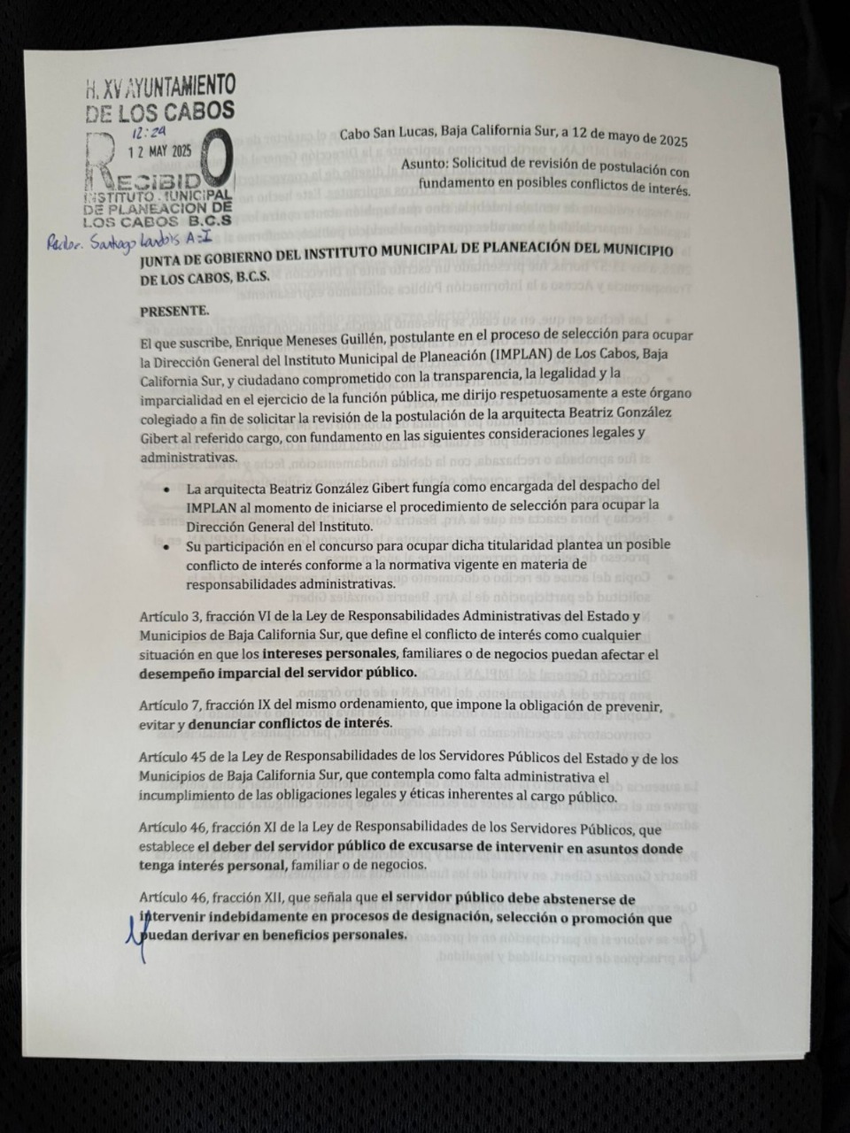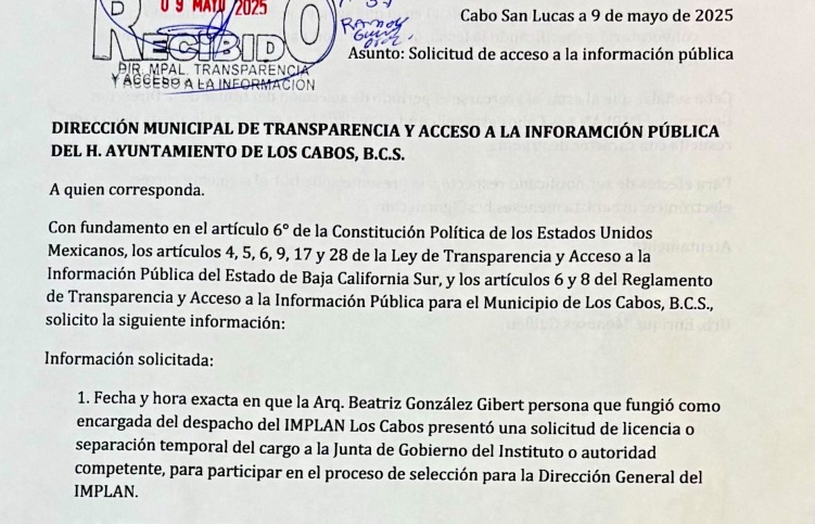 Por otro lado, el 7 de mayo en un boletín de prensa el Gobierno de Los Cabos informó que en el proceso para la elección del nuevo director del IMPLAN se habían recibido 35 solicitudes de participación, de los cuales “seis fueron seleccionadas como las mejor evaluadas en la primera etapa del proceso”.