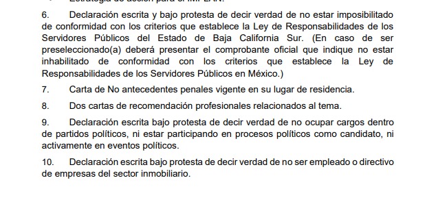 “Declaración escrita y bajo protesta de decir verdad de no estar imposibilitado de conformidad con los criterios que establece la Ley de Responsabilidades de los Servidores Públicos del Estado de Baja California Sur”.