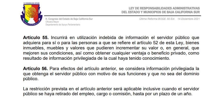 Ahora bien, Ley de Responsabilidades de los Servidores Públicos del Estado de Baja California Sur en su capítulo II “De las faltas administrativas graves de los Servidores Públicos”, establece en un artículo 55: