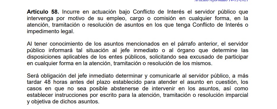 “Artículo 58. Incurre en actuación bajo Conflicto de Interés el servidor público que intervenga por motivo de su empleo, cargo o comisión en cualquier forma, en la atención, tramitación o resolución de asuntos en los que tenga Conflicto de Interés o impedimento legal”.