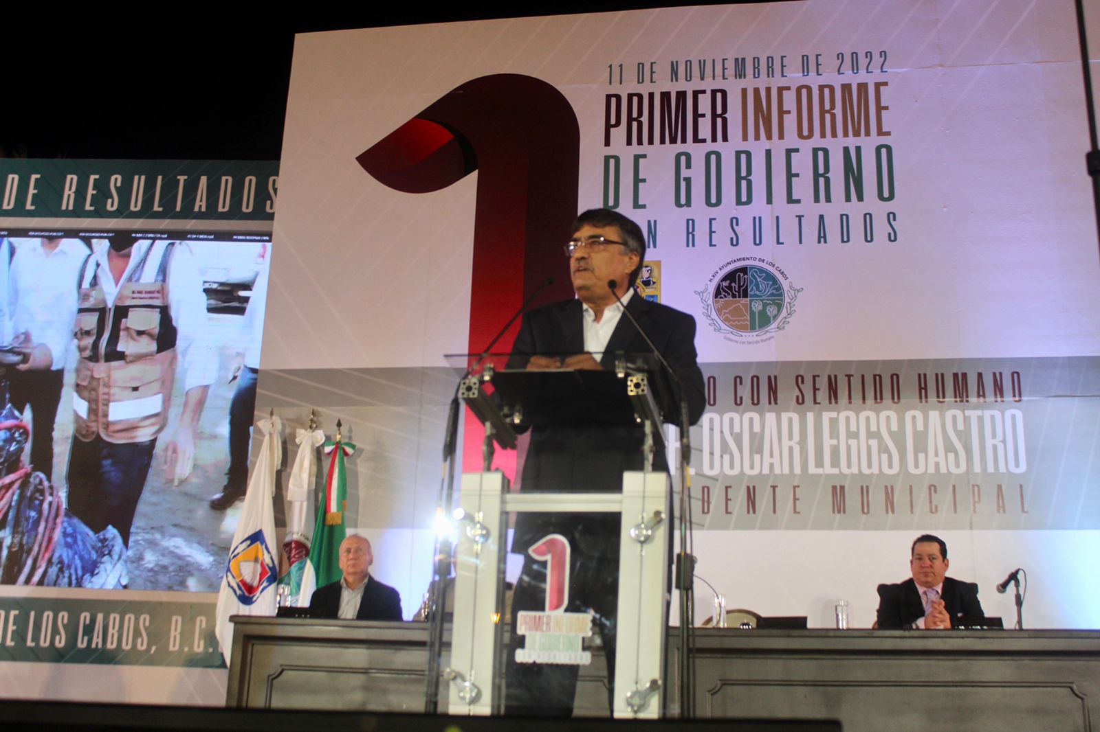 El alcalde de Los Cabos, Óscar Leggs Castro rindió su primer informe de gobierno este viernes en la plaza Antonio Mijares donde destacó los logros de su administración y reveló que ya cumplió con 34 de las 50 tareas con las que se comprometió en campaña, es decir, más del 68 por ciento.
