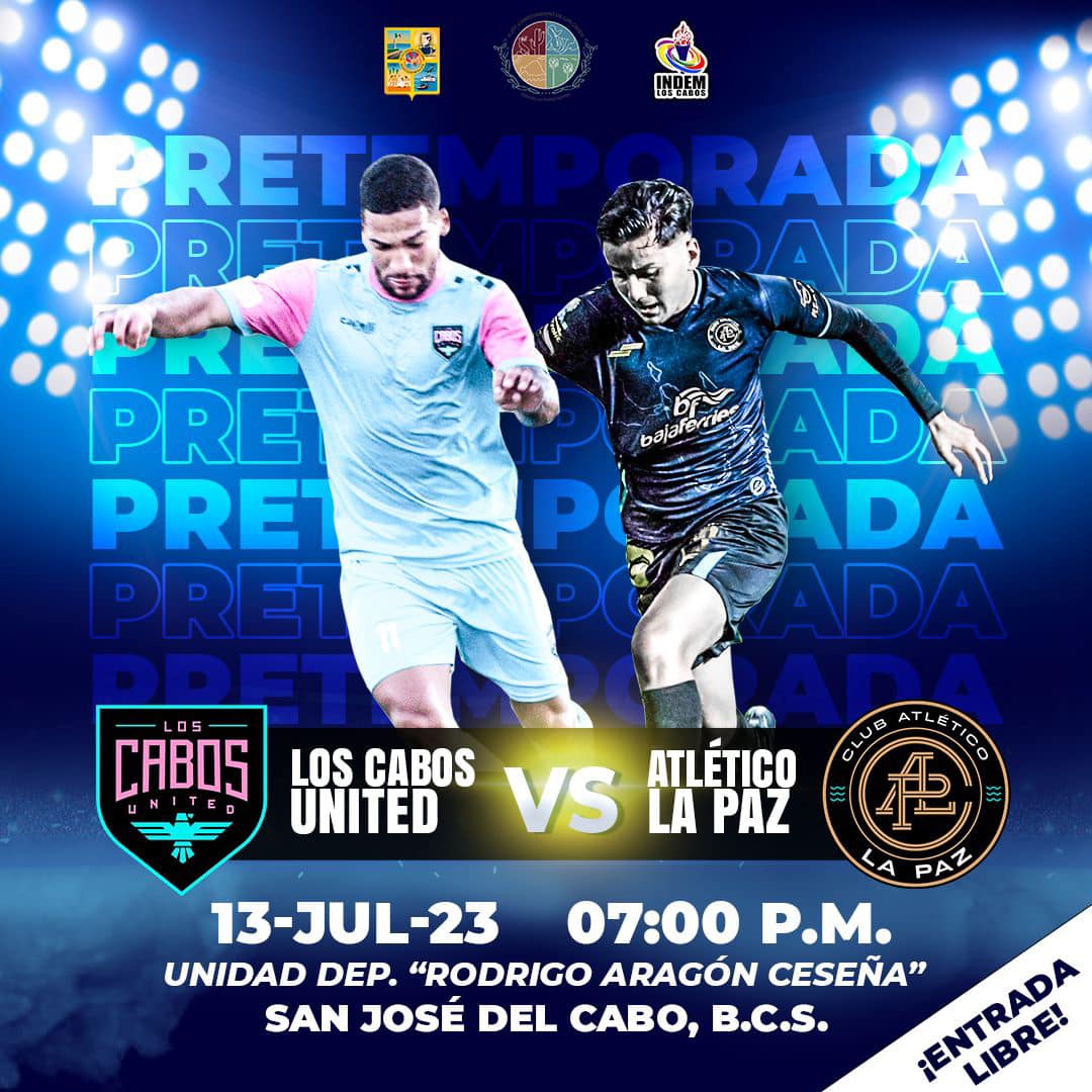 Los Cabos, B.C.S.- 12 julio 2023.- El Gobierno Municipal que preside Oscar Leggs Castro, a través del Instituto del Deporte del Municipio de Los Cabos (INDEM), invita a la ciudadanía a asistir al encuentro futbolístico de pretemporada entre los equipos Los Cabos United y el Club Atlético La Paz.
