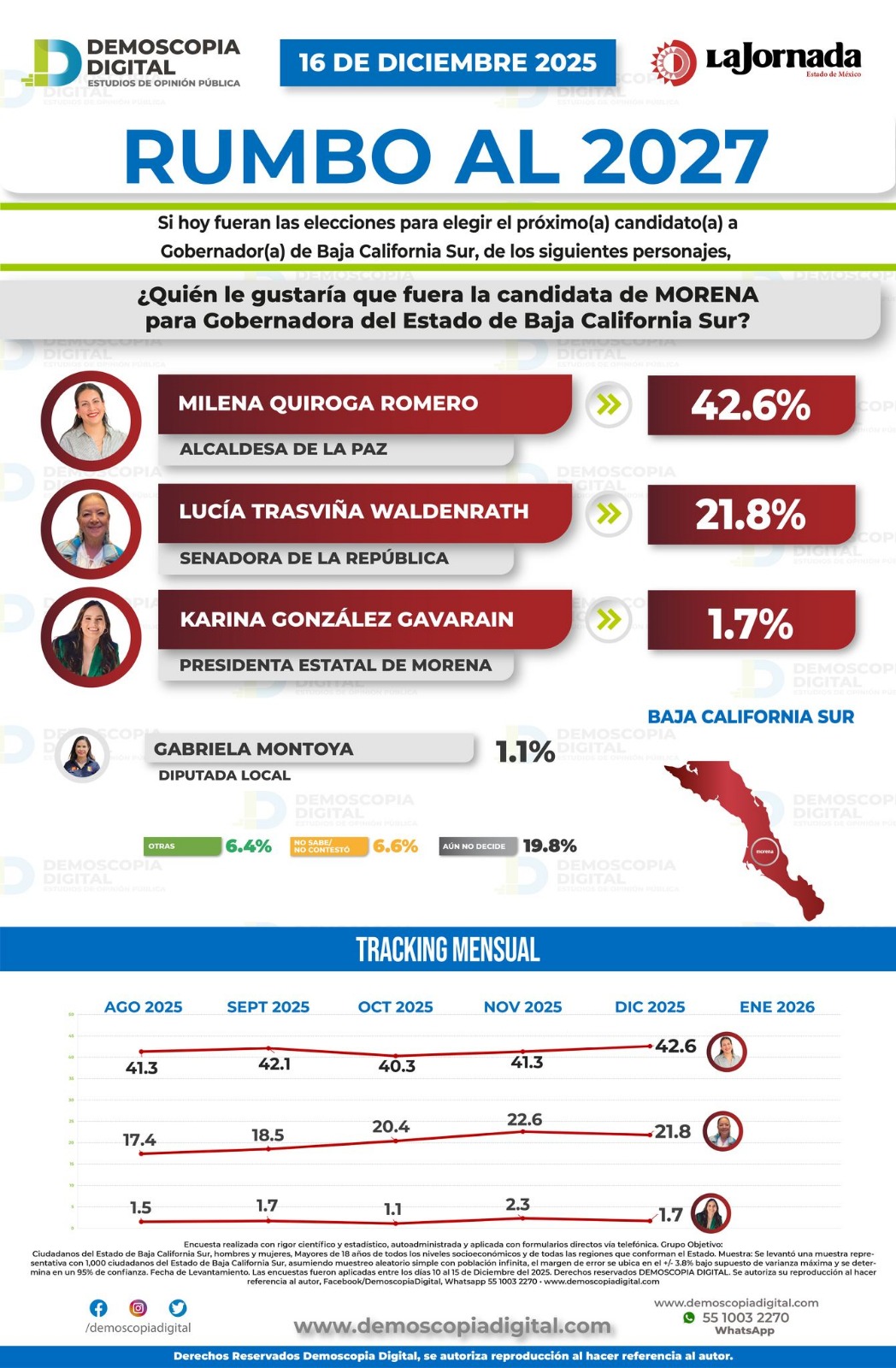 Y la empresa Demoscopía en su encuesta del 16 de diciembre “no se mete en broncas” y no hace un careo entre los alcaldes de La Paz y Los Cabos, al manejar preferencias por género, donde en el caso de que sea candidata, también según su medición, encabeza Milena Quiroga con 42.6%, contra el 21.8% de la senadora Lucía Trasviña y el 1.7% de la presidenta estatal de Morena, Karina Gonzáñez Gavarian.