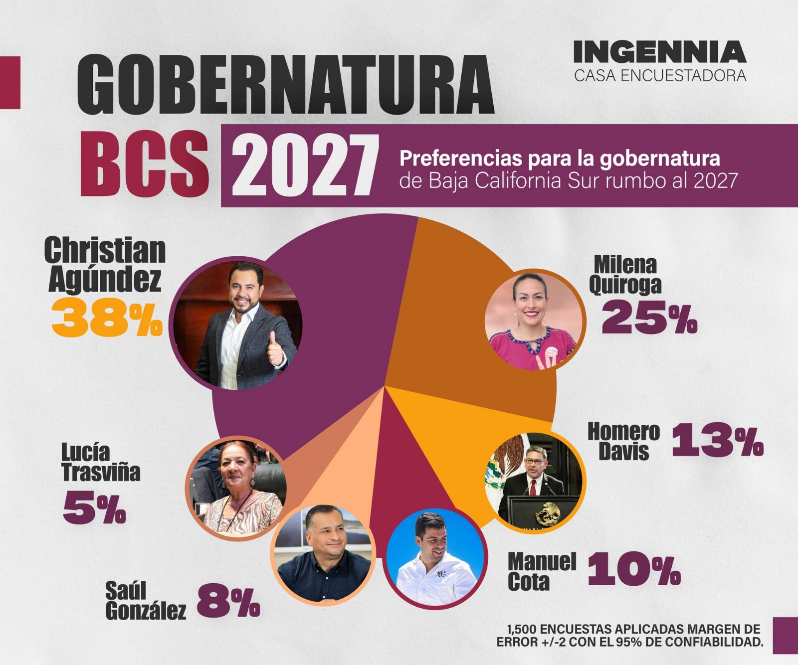Por su parte, la encuestadora Ingennia, con mil 500 entrevistas da la ventaja a Christian Agúndez con 38% de las preferencias, en segundo lugar Milena Quiroga con 25%, en tercero Homero Davis, con 13% y en un cuarto lugar Manuel Cota con 10%.