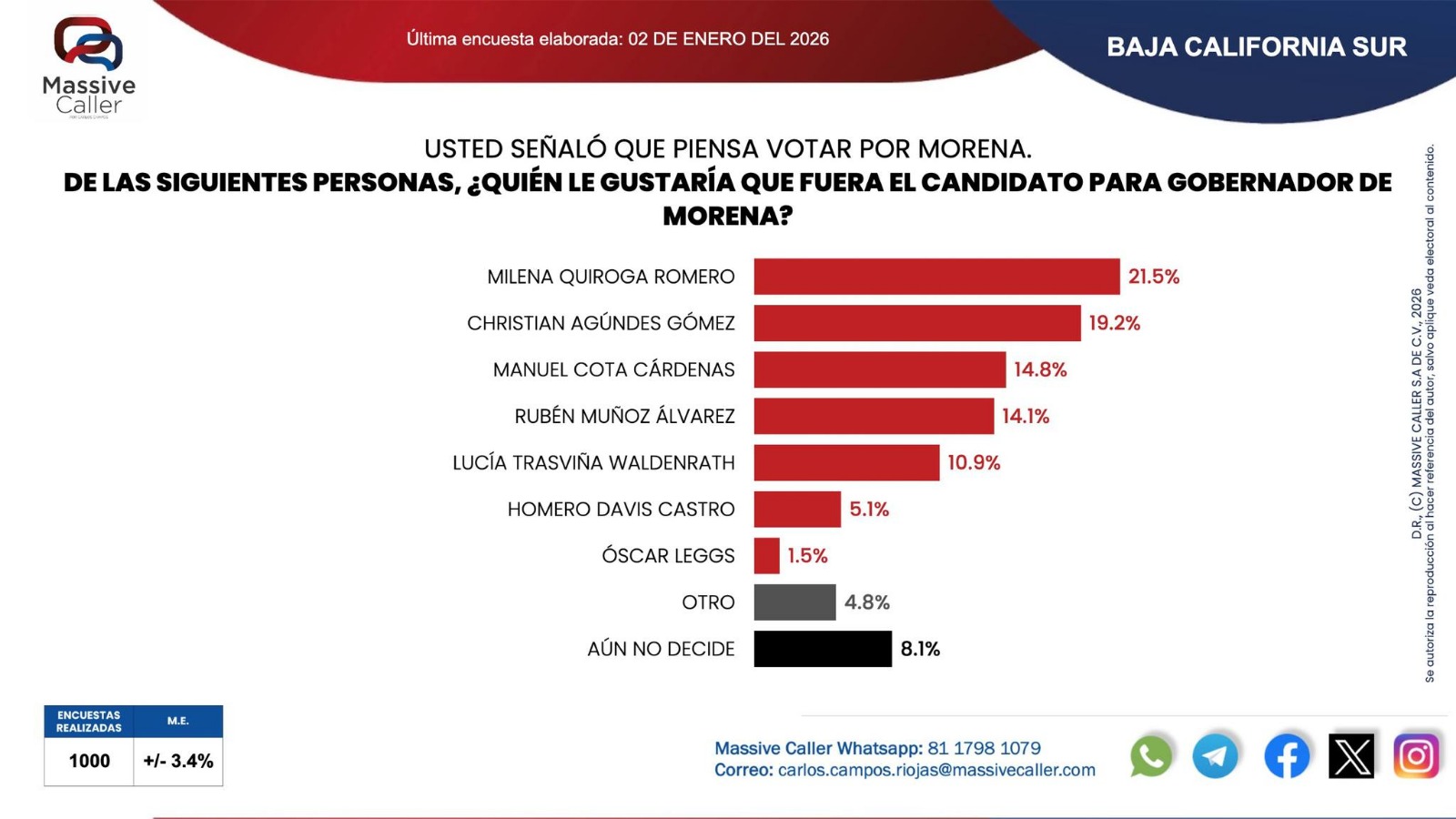 La encuesta de la empresa Masive Caller publicada el 2 de enero realizada a mil personas, presume una ligera ventaja de Milena Quiroga, con 21.5% de las preferencias, seguida de Christian Agúndez, con 19.2% y después Manuel Cota con 14.8%.