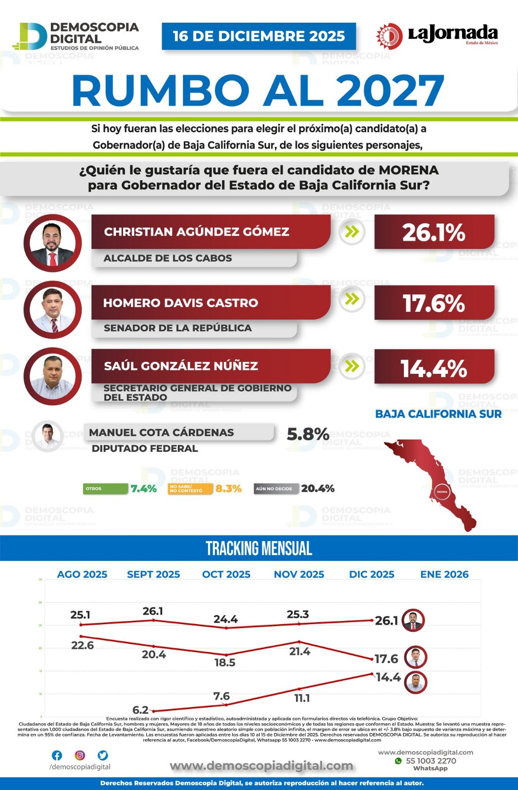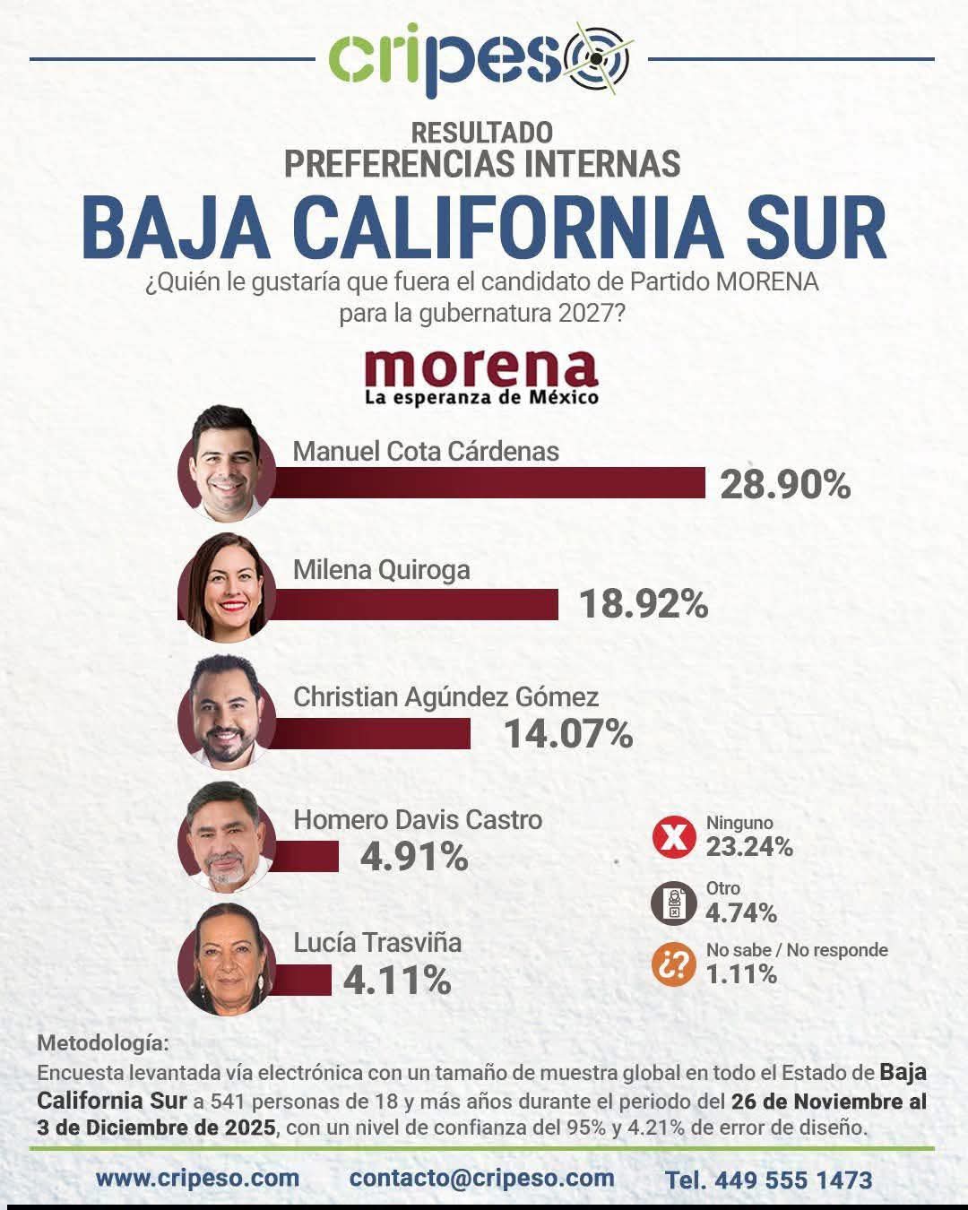 A finales de año y principios de este 2026 se desató una guerra de encuestas entre los tres principales contendientes a la candidatura a Gobernador de la 4T sudcaliforniana: Milena Quiroga, Chirstian Agúndez y Manuel Cota.