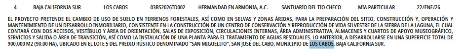 Los Cabos.-El 22 de enero de 2026, la asociación civil Hermandad en Armonía presentó ante la Secretaría de Medio Ambiente y Recursos Naturales (Semarnat) la solicitud de Manifestación de Impacto Ambiental (MIA), en modalidad particular, así como el cambio de uso de suelo en terrenos forestales, para un desarrollo inmobiliario que se plantea en la región de la Sierra La Laguna, municipio de Los Cabos, Baja California Sur, con el argumento de establecer un centro de conservación y reproducción de vida silvestre.