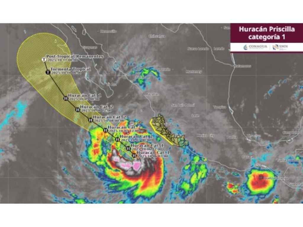 Los Cabos, BCS. – El huracán Priscilla continúa ganando fuerza sobre el Pacífico mexicano y se prevé que este martes 7 de octubre alcance la categoría 2 en la escala Saffir-Simpson, con vientos sostenidos de hasta 170 km/h y rachas de 205 km/h, mientras su centro se ubique a unos 350 kilómetros al sur de Cabo San Lucas, informó el Servicio Meteorológico Nacional (SMN).