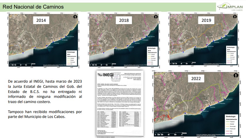 1.- “De acuerdo al INEGI, hasta marzo de 2023 la Junta Estatal de Caminos del Gob. Del Estado de B.C.S. no ha entregado ni informado de ninguna modificación al trazo del camino costero. Tampoco han recibido modificaciones por parte del Municipio de Los Cabos”.
