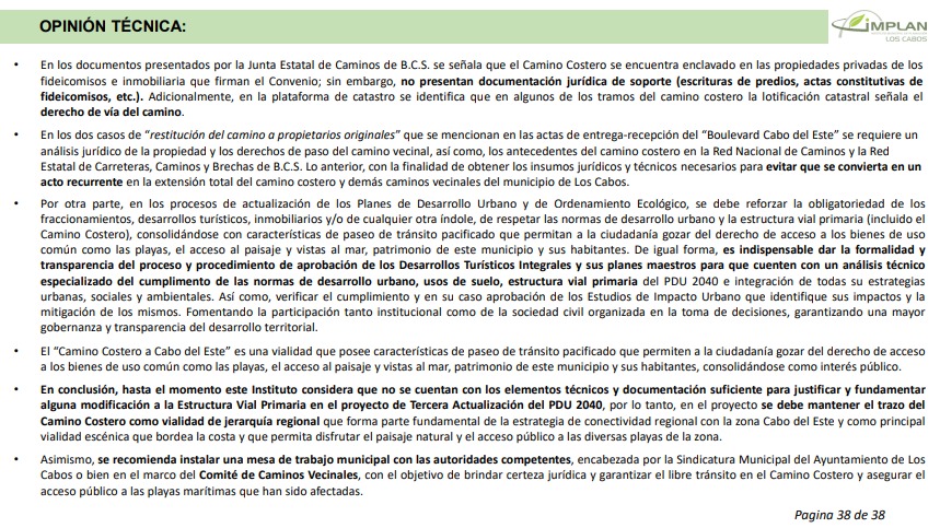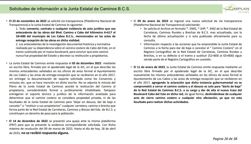 El documento en poder de HOY BCS, signado por el entonces director del IMPLAN, Ussiel García (quien fue destituido de su cargo fuera de reglamento) consta de un resumen ejecutivo y 24 anexos, donde se explica a detalle las condiciones históricas, legales, cartográficas y de movilidad en torno al camino vecinal, incluyendo solicitudes de información a la Junta Estatal de Caminos.