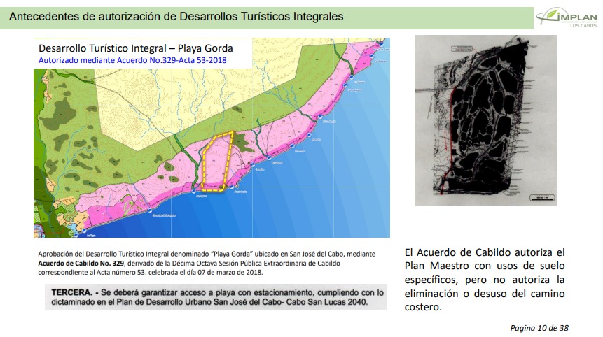 El 10 de octubre de 2024 mediante el oficio IMPLAN/307/2024 el Instituto Municipal de Planeación hizo entrega al regidor Jesús Alberto Alvarado de un expediente completo en torno al camino costero de Cabo del Este, donde se le daban argumentos técnicos y legales para recomendar mantener el camino vecinal en la tercera actualización del Plan de Desarrollo Urbano.