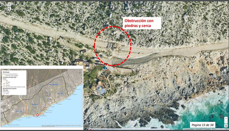 5.- Se realizó un levantamiento de campo para verificar los accesos a playa y identificaron un total de 19 accesos a playa y SOLO 15 DE ELLOS CUENTAN CON CAMINO DE LIBRE TRANSITO HASTA LAS PLAYAS. TAMBIÉN SE IDENTIFICARON CUATRO OBSTRUCCIONES FÍSICAS ARTIFICIALES QUE IMPIDEN EL LIBRE TRÁNSITO EN APROX. 5 KM DEL CAMINO COSTERO Y CIERRAN/DISMINUYEN CUATRO ACCESOS A PLAYA MARÍTIMA (PLAYA GORDA, ZACATITOS, ZACATÓN Y ROMERILLO).
