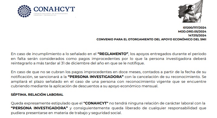 “Queda expresamente estipulado que el ‘CONAHCYT’ no tendrá ninguna relación de carácter laboral con la ‘PERSONA INVESTIGADORA’ y consiguientemente queda liberado de cualquier responsabilidad que pudiera presentarse en materia de trabajo y seguridad social.”